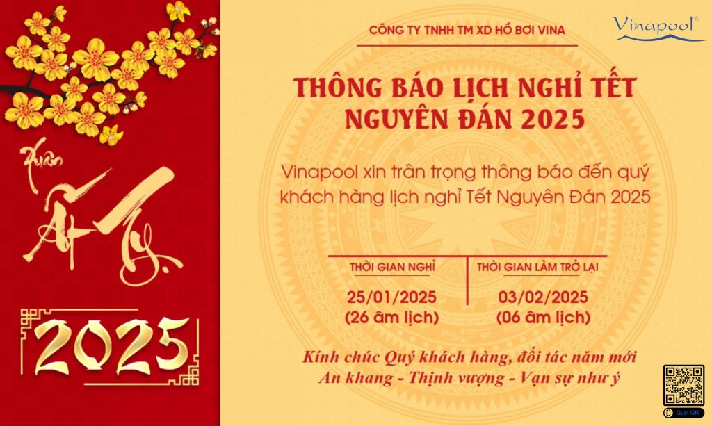Trước tiên, chúng tôi xin chân thành cảm ơn Quý khách hàng, Quý đối tác đã tin tưởng và đồng hành cùng Vinapool trong suốt thời gian qua. Nhân dịp Tết Nguyên Đán Ất Tỵ 2025, chúng tôi xin thông báo lịch nghỉ lễ của công ty như sau:
